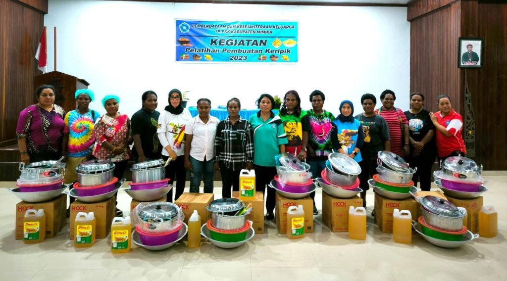 Dalam rangka memberdayakan mama-mama Papua, Tim Penggerak Pemberdayaan dan Kesejahteraan Keluarga (TP-PKK) Kabupaten Mimika menggelar pelatihan pembuatan keripik dari bahan lokal. Pelatihan digelar di Gedung Keuskupan Timika, Sabtu (16/12/2023).
