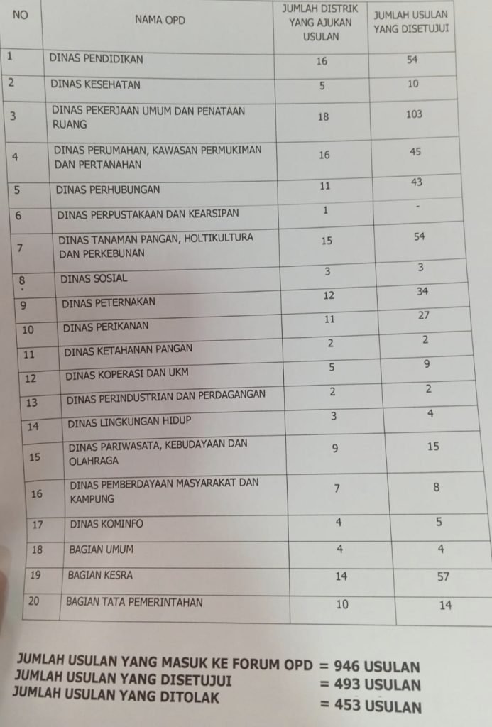 Dijelaskan, bahwa total jumlah program yang diusulkan 18 distrik sebanyak 946 program, 453 ditolak dan 493 yang disetujui.