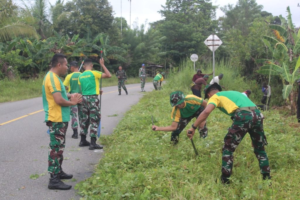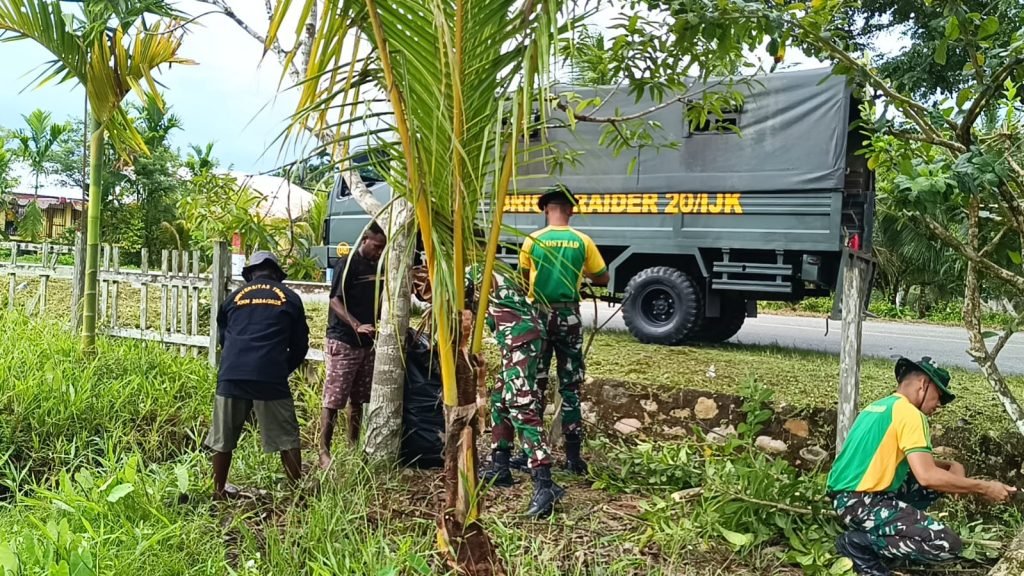 Prajurit Brigif 20/IJK/3 Kostrad dan Babinsa setempat beserta Masyarakat dan Mahasiswa KKN Universitas Timika bahu-membahu membersihkan rumput liar dan tanaman rimbun di lingkungan Gereja dan sekitaran jalan raya.