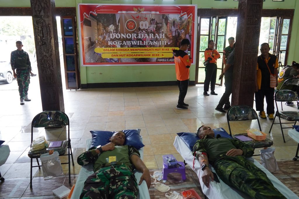 Dalam rangka memperingati Hari Ulang Tahun (HUT) ke-80 Republik Indonesia dan HUT ke-6 Kogabwilhan III, Komando Gabungan Wilayah Pertahanan (Kogabwilhan) III menggelar bakti sosial donor darah di Aula Yonif 754/ENK, Timika, Jumat (15/8/2025).