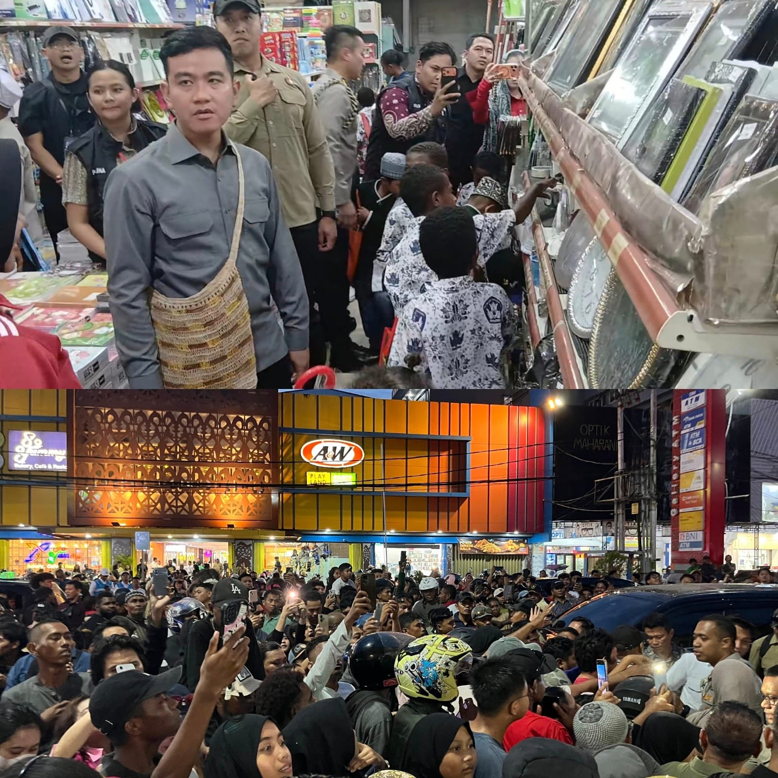 Bagaimana tidak, ketika Wapres Gibran dan rombongan tiba di depan Toko Meriah, seketika itu juga ribuan warga langsung datang memadati lokasi kunjungan seraya berteriak memanggil nama Gibran.