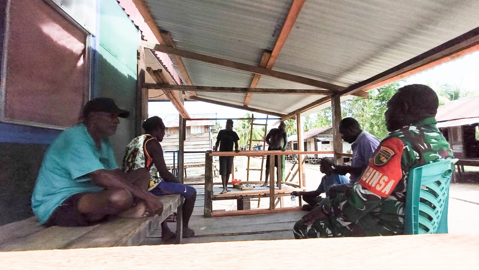 Personel Satgas TMMD Reguler ke-128 Kodim 1710/Mimika, Sertu Amandus Mutiyu, melaksanakan komunikasi sosial (komsos) bersama warga Kampung Keakwa, Distrik Mimika Tengah, Sabtu (25/4/2026).